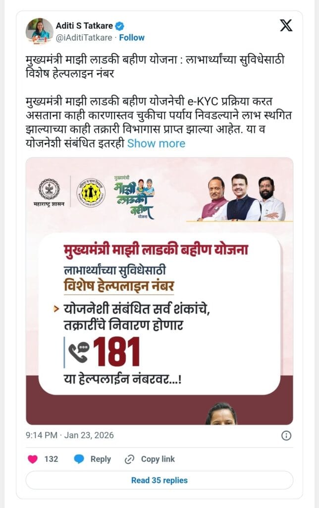 ​गेल्या काही दिवसांत नोव्हेंबर आणि डिसेंबर 2025 चे हप्ते वेळेवर न मिळाल्याने राज्यातील काही भागांत, विशेषतः विदर्भातील जिल्ह्यांमध्ये महिलांनी नाराजी व्यक्त केली होती. या पार्श्वभूमीवर प्रशासनाने ही हेल्पलाईन सुविधा तातडीने सुरू केली आहे.