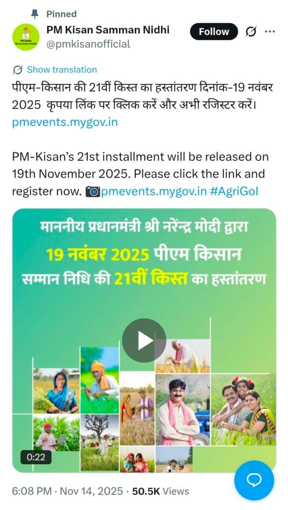 PM Kisan च्या अधिकृत X (ट्विटर) हँडलवरून माहिती देण्यात आली की देशातील 9 कोटीहून अधिक शेतकऱ्यांच्या खात्यात हा 21वा हप्ता थेट जमा होणार आहे. त्यामुळे अनेक दिवसांच्या प्रतीक्षेनंतर शेतकऱ्यांना मोठा दिलासा मिळणार असून रब्बी हंगामाच्या तयारीतही मदत होणार आहे.